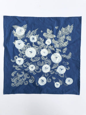 Hand screen printed cotton bandana, patterned with fireflies and resurrection ferns.