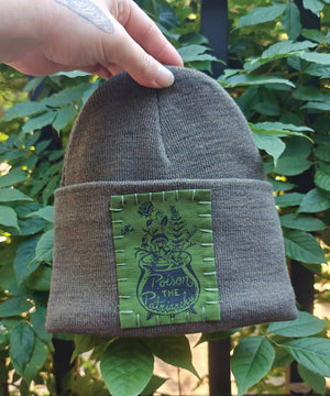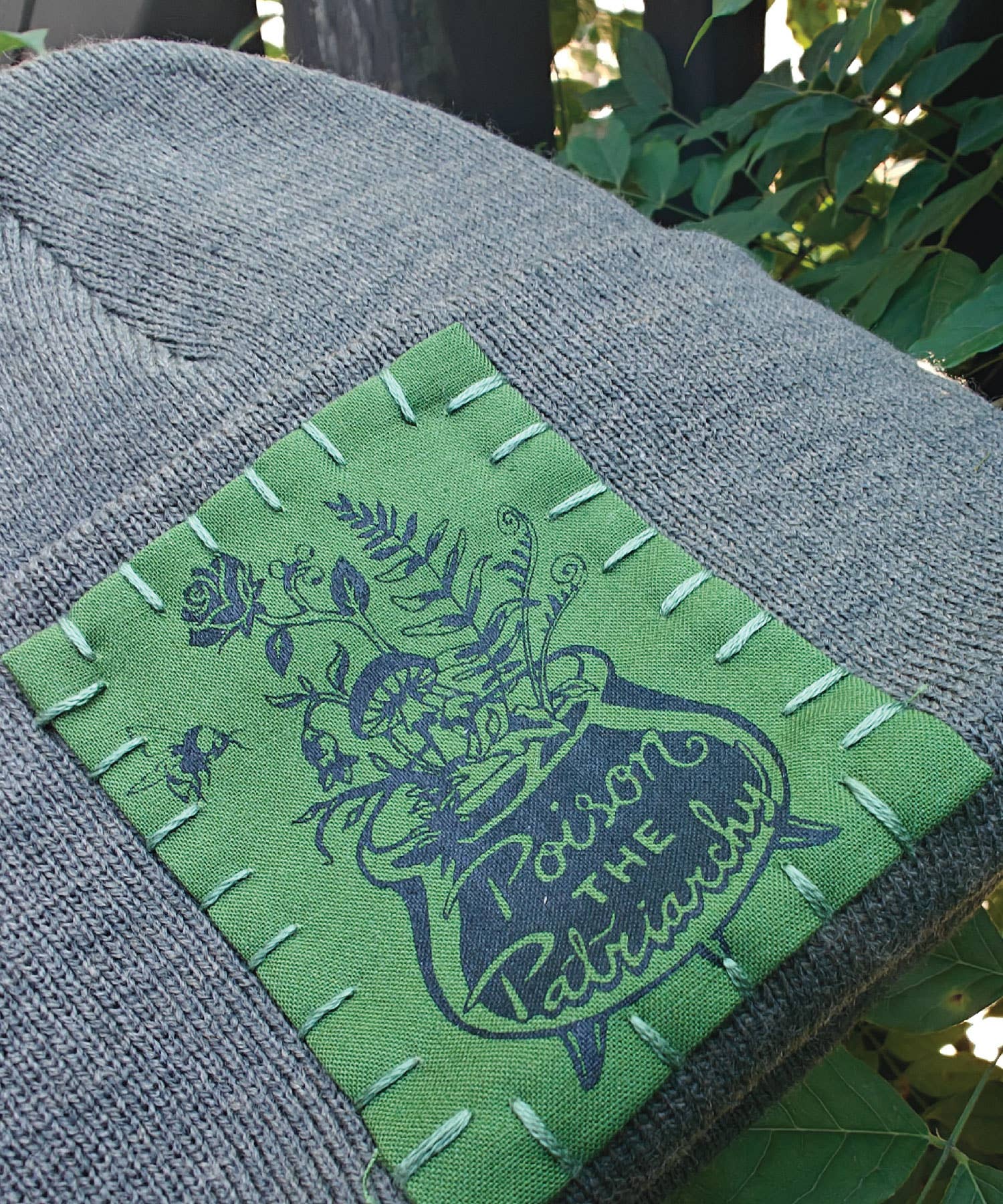 Cozy knit hat with hand stitched patch, made with cotton and recycled polyester!