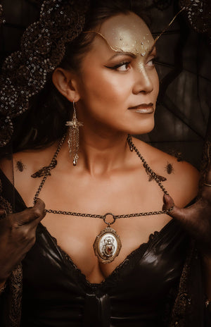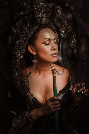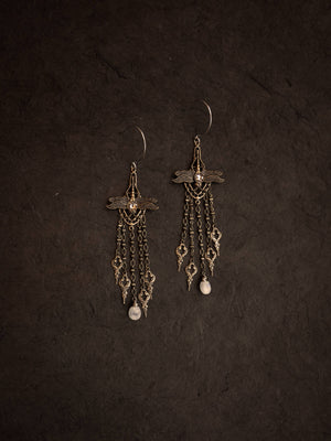 The dragonfly suspends inverted, a messenger with ears in one world and its mouth in another. She swings across thresholds, a voice flickering between the living and the dead, carrying messages of reassurance and premonition from across the divide. Wear these when you need a sign or when you feel the veil shift.