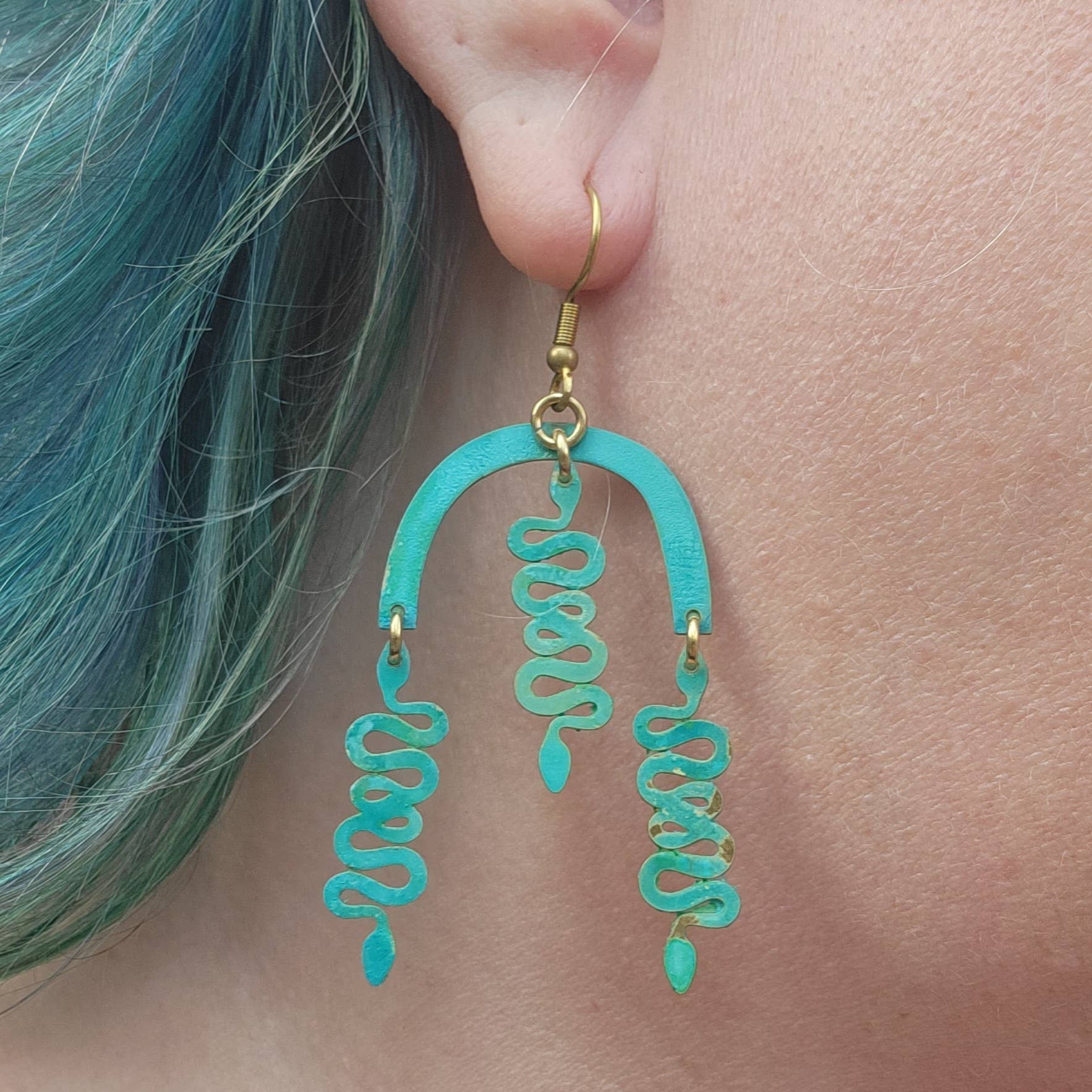 Brass components have been painted with verdigris green & ocean blue patinas. The pieces are then sealed with 2 layers of Protectaclear clear protective coat.
