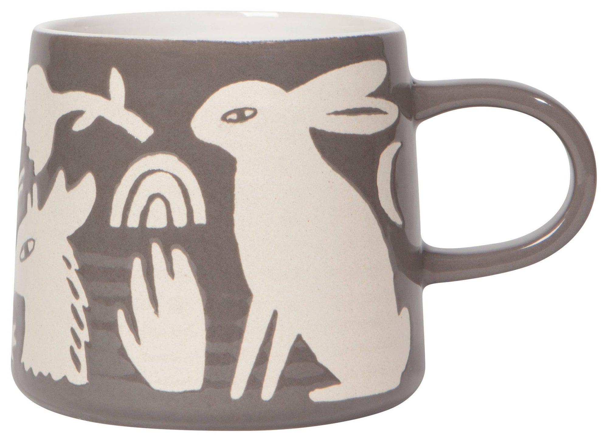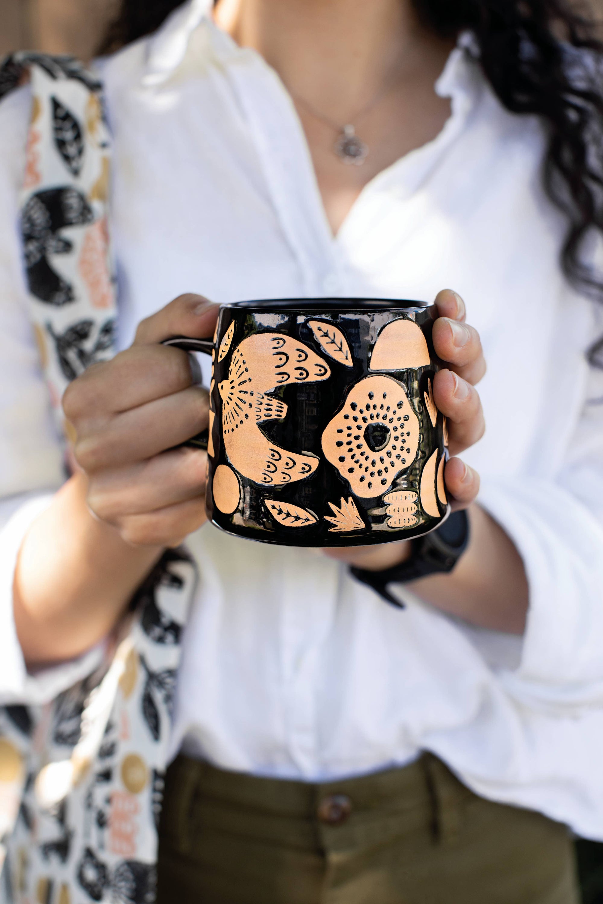 Black Cat and Many Mushrooms Mug with Blue Glaze
