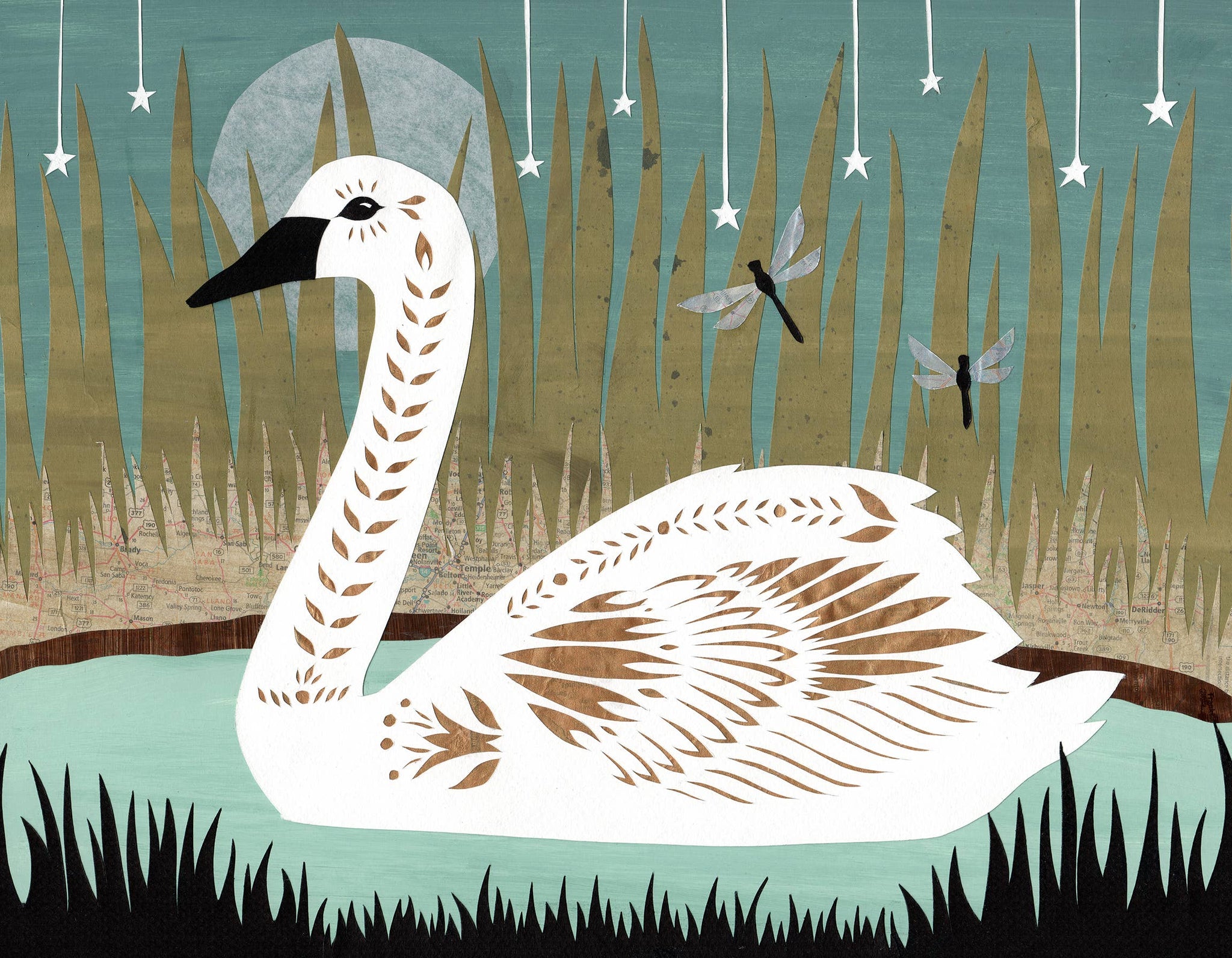 This is a signed and titled printed reproduction of an original hand cut paper collage by Angie Pickman.