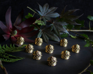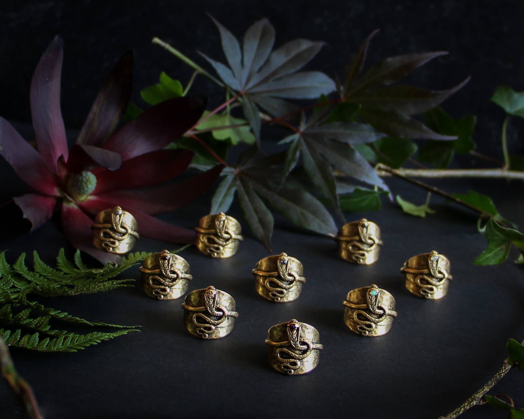 Bronze-cast cuff rings with a golden hue with a rhinestone set on the hood of the serpent.