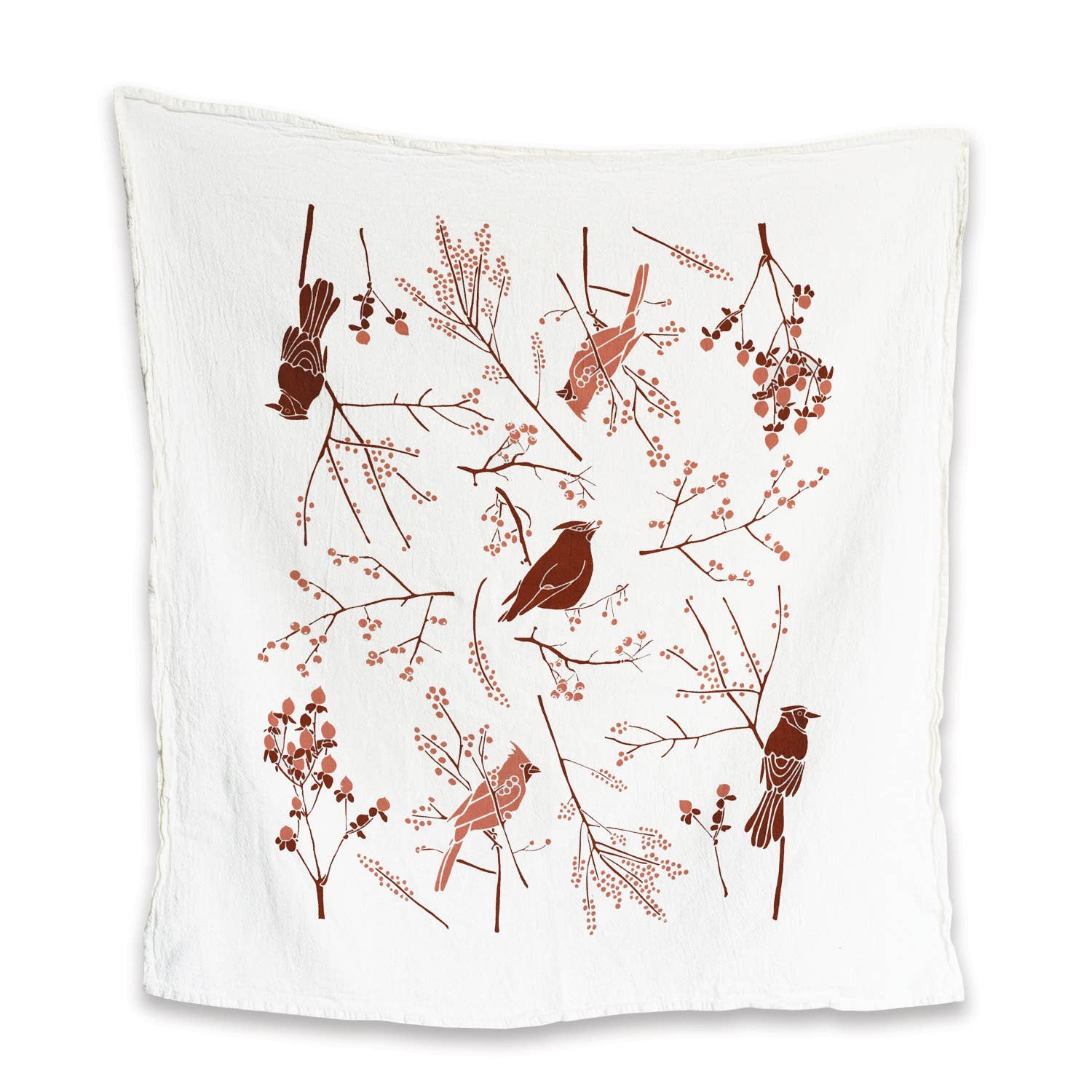 Liven up your kitchen or bar cart with a pop of festive color with June & December's cotton flour sack towel depicting winter berries and cheerful red birds