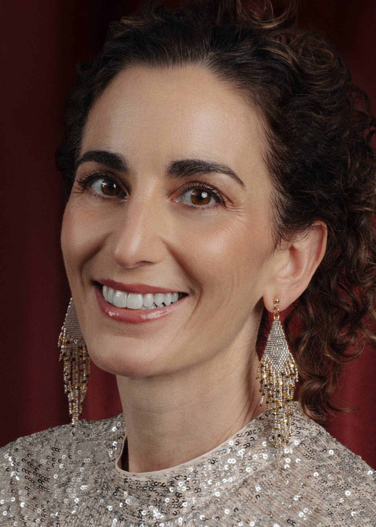 The cascading fringe is made from a confetti-like mix of glass beads with different metallic tones and finishes adding drama and dimension.