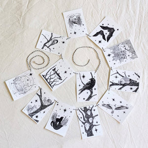 A garland of 12 mini print flags featuring all 12 designs from the celestial fauna collection by Moth Folk Studio