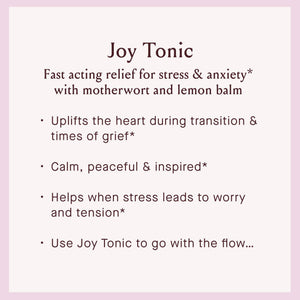 A blend of aromatic plants such as motherwort, lemon balm, and linden contains volatile constituents that help rebalance our internal state of tension, offering relief from occasional stress and anxiety. Uplift the heart, go with the flow, & elevate your mood with Joy Tonic!