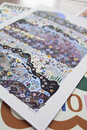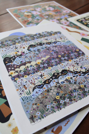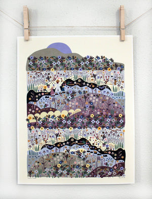 This is an archival print of Leah's "Moon Walk" illustration in tones of blue, yellow, brown, orange, beige, pink, purple, gray, black, and green. The background is a light cream. Inspired by walks in nature with her daughters. It is printed with pigment ink on 110 lb acid free artisan paper.
