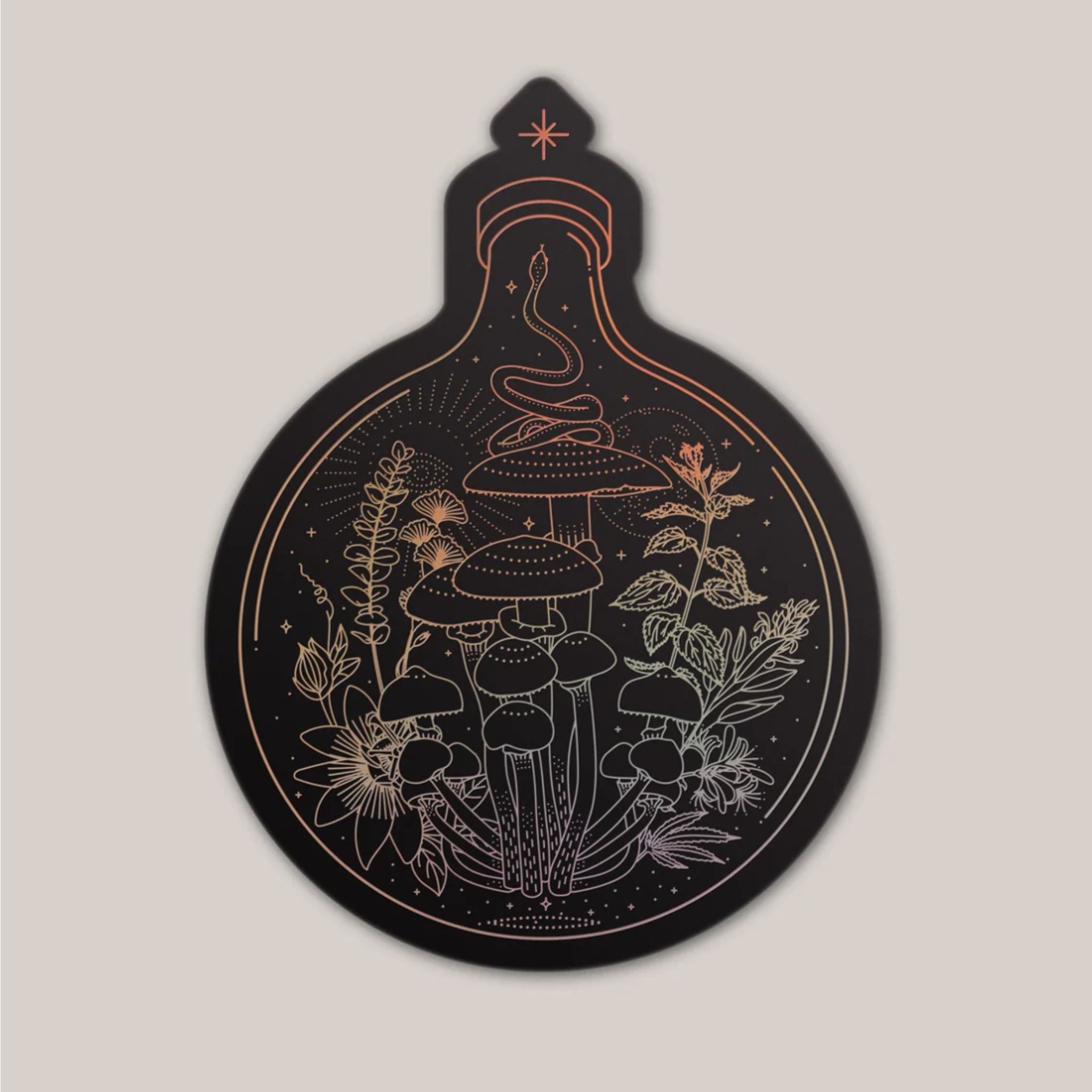 The Astro-Mycology sticker features medicinal mushrooms and potent herbs.