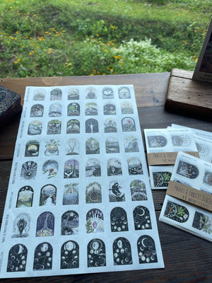 Thin little tiny washi paper tape stickers of every card in the new Phases & Forests Oracle for daily journaling or embellishment.